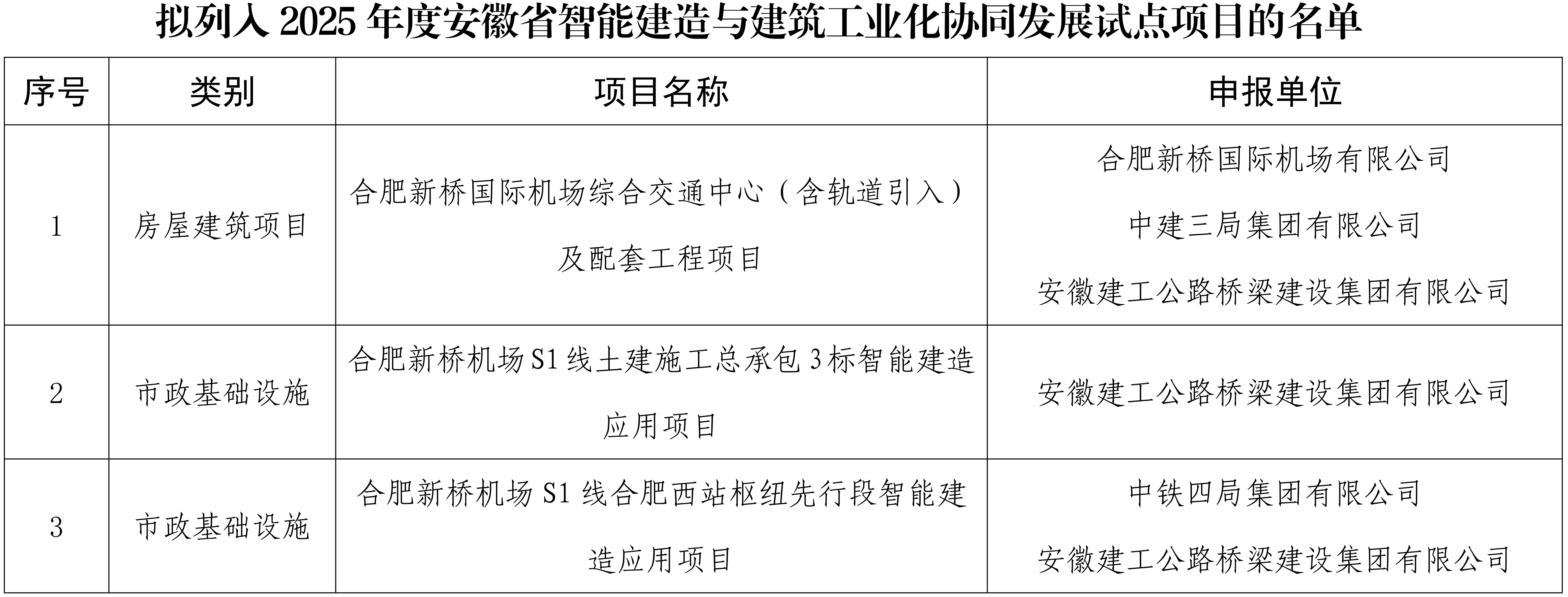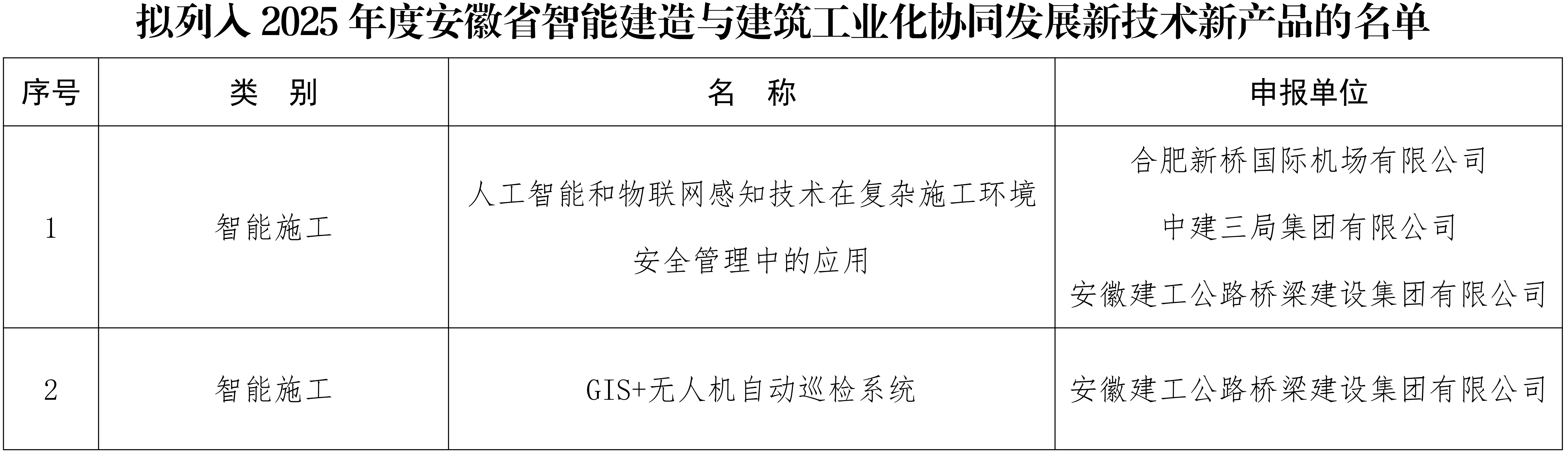 近日,安徽省住房和城鄉(xiāng)建設廳公布了2025年度安徽省智能建造與建筑工業(yè)化協(xié)同發(fā)展新技術新產(chǎn)品及試點項目,公司“新橋機場S1線土建施工總承包3標”、“新橋機場S1線合肥西站樞紐先行段”、“合肥新橋國際機場綜合交通中心(含軌道引入)及配套工程”三個項目,“人工智能和物聯(lián)網(wǎng)感知技術在復雜施工環(huán)境安全管理中的應用”、“GIS+無人機自動巡檢系統(tǒng)”等兩項產(chǎn)品應用成功入選。