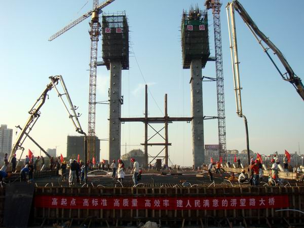 自17日下午15時30分至19日凌晨5時30分,經(jīng)過現(xiàn)場百余名一線工人和項目部全體技術(shù)人員一天兩夜無間斷連續(xù)作業(yè)38個小時的艱苦奮戰(zhàn),主橋85m邊跨混凝土一次性現(xiàn)澆圓滿完成,這是淠望路大橋上部結(jié)構(gòu)施工的又一階段性勝利。同時,它的澆筑完成也為下階段斜拉索施工及保證總工期奠定了堅實的基礎(chǔ),這是我們安徽路橋人發(fā)揚(yáng)“特別能吃苦、特別能戰(zhàn)斗”精神的再一次生動體現(xiàn)。