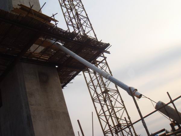 該斜拉索長19.0米,重1噸,由43根鋼絞線組成。據(jù)悉,六安淠望路大橋主塔共有斜拉索60根,由高強(qiáng)度、低松馳的光面鋼絞線組成。單根鋼絞線直徑為15.2mm,標(biāo)準(zhǔn)強(qiáng)度fpk=11860Mpa。斜拉索采用三層防護(hù):第一層涂油脂或石蠟,第二層為單根鋼絞線熱擠單層PE層,第三層整體索外包HDPE雙層護(hù)套。主塔的左、右幅索塔各布置了15對斜拉索,最大索長123.0米,重12噸,由73根鋼絞線組成。 整個斜拉索施工計劃到2010年4月份完成。