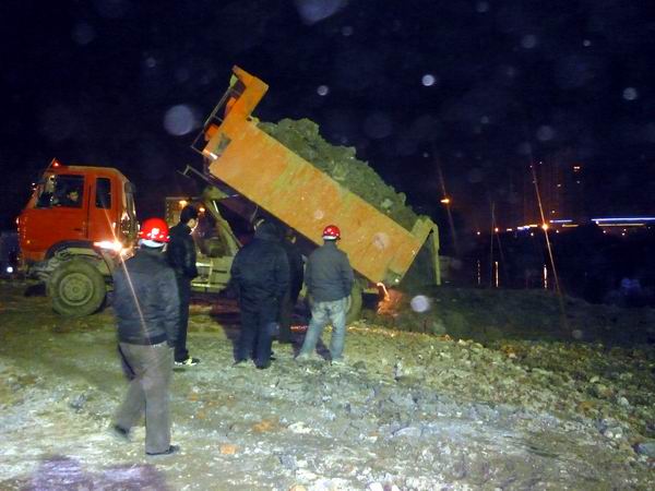 當(dāng)12月19日,宋斗灣路完成第一根樁(位于南淝河北側(cè),屬于3#橋臺(tái))的開(kāi)挖澆注工作后,項(xiàng)目經(jīng)理部就開(kāi)始籌劃南淝河南側(cè)的筑島圍堰工作。12月24日,當(dāng)3#橋臺(tái)的六根樁全部澆注完成后,當(dāng)天晚上仍繼續(xù)前一晚的筑島工作。每次筑島時(shí),現(xiàn)場(chǎng)橋梁技術(shù)員、測(cè)量技術(shù)員和安全員都和工人們一起奮戰(zhàn),而每次奮戰(zhàn)都是一個(gè)通宵。截至25日,南淝河筑島圍堰共計(jì)用土近270車(chē),約4600方,筑島面積和筑島深度達(dá)到預(yù)案和監(jiān)理要求,符合現(xiàn)場(chǎng)施工的實(shí)際要求。至此,筑島圍堰工作圓滿(mǎn)完成。