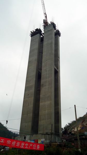 巖子腳特大橋?yàn)檫B續(xù)性剛構(gòu)橋,兩主墩之間跨度160米。主橋左、右幅均為混凝土連續(xù)箱梁,是水盤線幾個(gè)重點(diǎn)控制工程之一,也是影響我項(xiàng)目工期的關(guān)鍵性工程。該橋主體橋墩都有4根墩柱,高度均超過58米,此次完成封頂?shù)闹鳂?SPAN lang=EN-US>4號墩是迄今為止我公司施工過的最高橋墩。
