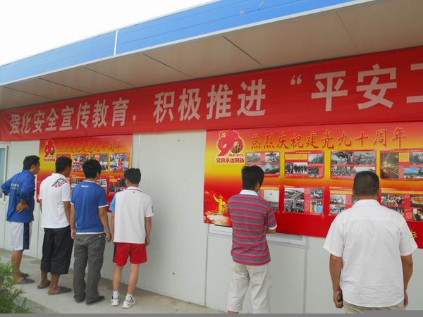 《黨旗永遠(yuǎn)飄揚》系列圖片展用大量翔實的資料照片生動地展現(xiàn)了中國共產(chǎn)黨90年來的輝煌成就。大家一邊觀看一邊激動地議論和感慨:“有了共產(chǎn)黨,才有了中國翻天覆地的變化,才有了中國繁榮富強(qiáng)的今天”。通過參觀,更加激發(fā)了員工們對中國共產(chǎn)黨的熱愛之情,堅定了大家的理想信念;激勵了項目一線員工更加積極的投入到蚌淮高速的施工建設(shè),為實現(xiàn)公司的“十二五”戰(zhàn)略規(guī)劃做出自己應(yīng)有的貢獻(xiàn)。晚上7點,在項目操場上,露天展映的抗日戰(zhàn)爭影片有紅色經(jīng)典影片《七七事變》、《狼牙山五壯士》、《地道戰(zhàn)》,讓大家又受了一次紅色精神的洗禮。