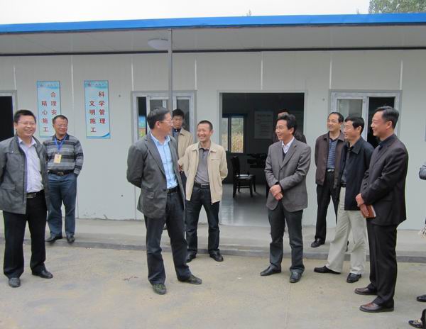 王傳鵬一行先來到我標(biāo)段正在建設(shè)中的預(yù)制場(chǎng)拌合站,并聽取了項(xiàng)目經(jīng)理杜海峰的匯報(bào)。接著來到我標(biāo)段項(xiàng)目部,調(diào)研項(xiàng)目駐地建設(shè)情況,就項(xiàng)目駐地建設(shè)作出具體指導(dǎo)。他要求項(xiàng)目駐地的實(shí)驗(yàn)室及相關(guān)配套設(shè)施要盡早完備,并指出在地方事務(wù)上,出現(xiàn)問題要及時(shí)與縣指和鄉(xiāng)鎮(zhèn)進(jìn)行溝通,協(xié)調(diào)解決。同時(shí),他要求縣指繼續(xù)做好各項(xiàng)協(xié)調(diào)工作,確保蚌固路改造工程于10月底順利施工。